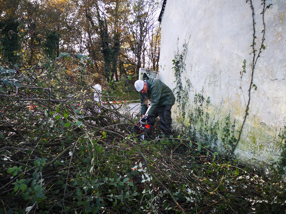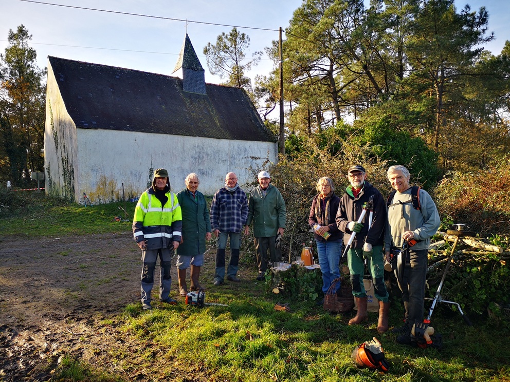 A peine créée, l’association Regain chapelle Saint-Barnabé s’active ! Les bénévoles se sont retrouvés le 22 novembre 2024 pour un premier chantier d’embellissement du site. Au programme, tronçonnage du bouleau gênant, enlèvement des lauriers palme envahissants et taille des cotoneasters.